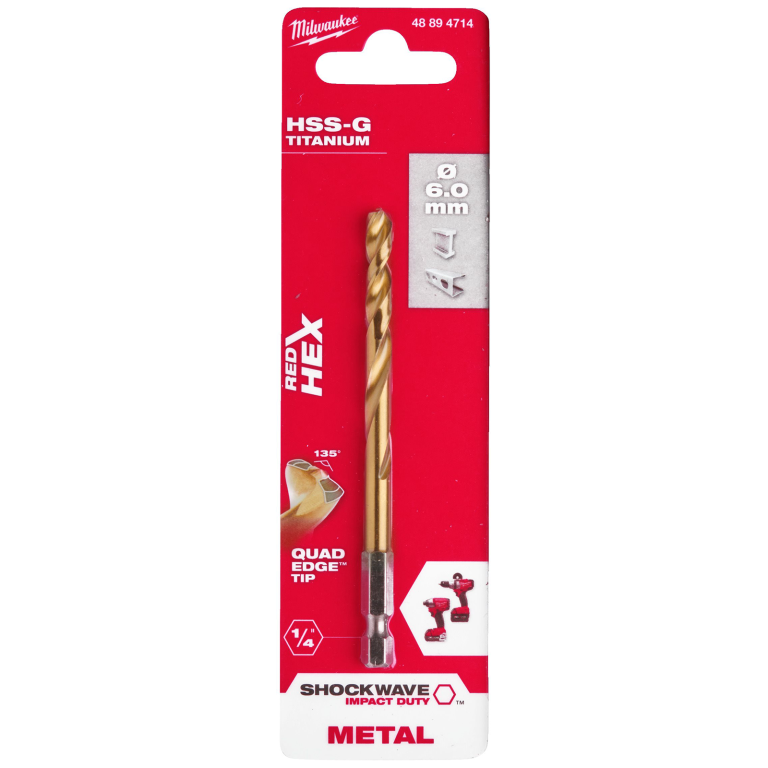 RED HEX 1/4in Hex Shank Drill Bit 6x105mm HSS Titanium Nitride